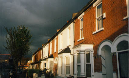 sunshine and black clouds on London street